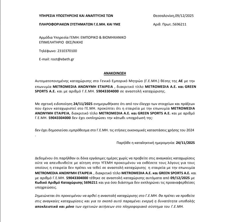 Ενώ, μέχρι σήμερα, δεν έχει ακόμη δημοσιεύσει τις οικονομικές καταστάσεις του 2024 της Metromedia στο ΓΕΜΗ.