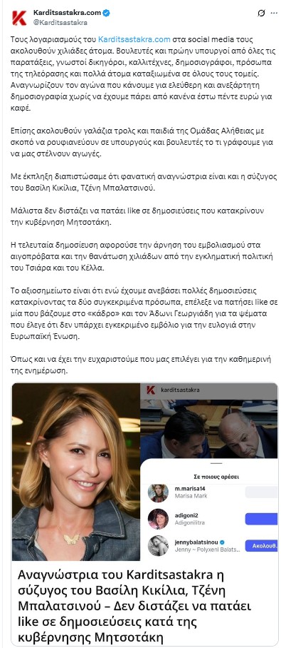 Το τελευταίο διάστημα, στο παρασκήνιο της κυβέρνησης, έχει ανοίξει μια συζήτηση που δεν αφορά πολιτικό πρόσωπο, αλλά το ψηφιακό αποτύπωμα της Τζένης Μπαλατσινού. Η σύζυγος του υπουργού Ναυτιλίας, Βασίλη Κικίλια, εμφανίζεται να ακολουθεί και να αλληλεπιδρά με μέσο που διατηρεί ιδιαίτερα αιχμηρή στάση απέναντι στην κυβέρνηση και συγκεκριμένα απέναντι στον Πρωθυπουργό και κορυφαίους υπουργούς.