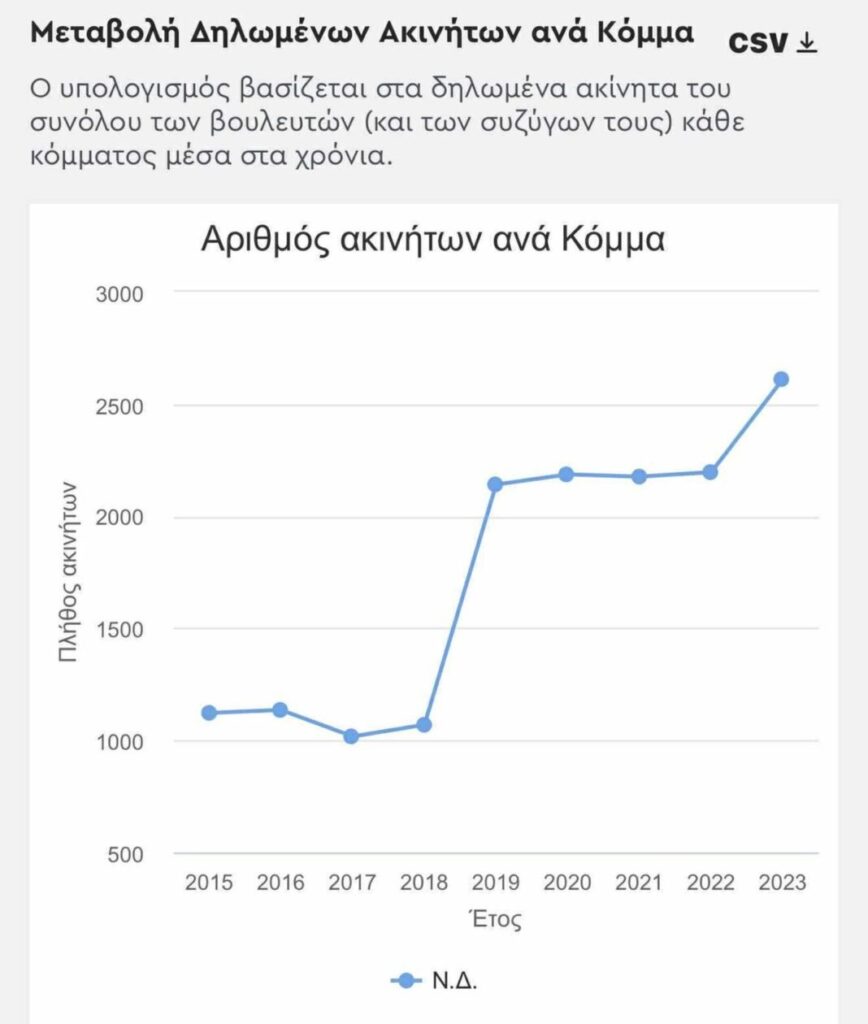 Σύμφωνα με τα ίδια στοιχεία, από το 2019 και μετά, οι βουλευτές της Νέας Δημοκρατίας δηλώνουν θεαματική αύξηση ακινήτων.