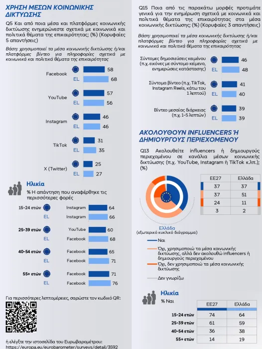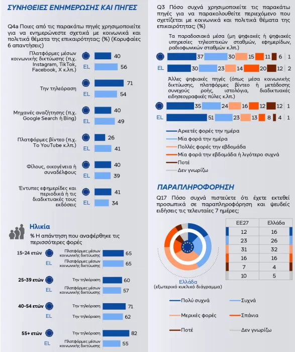 Το Facebook παραμένει η πρώτη πηγή ενημέρωσης για το 68% των πολιτών, ποσοστό σημαντικά υψηλότερο από τον μέσο όρο της Ε.Ε. (58%).