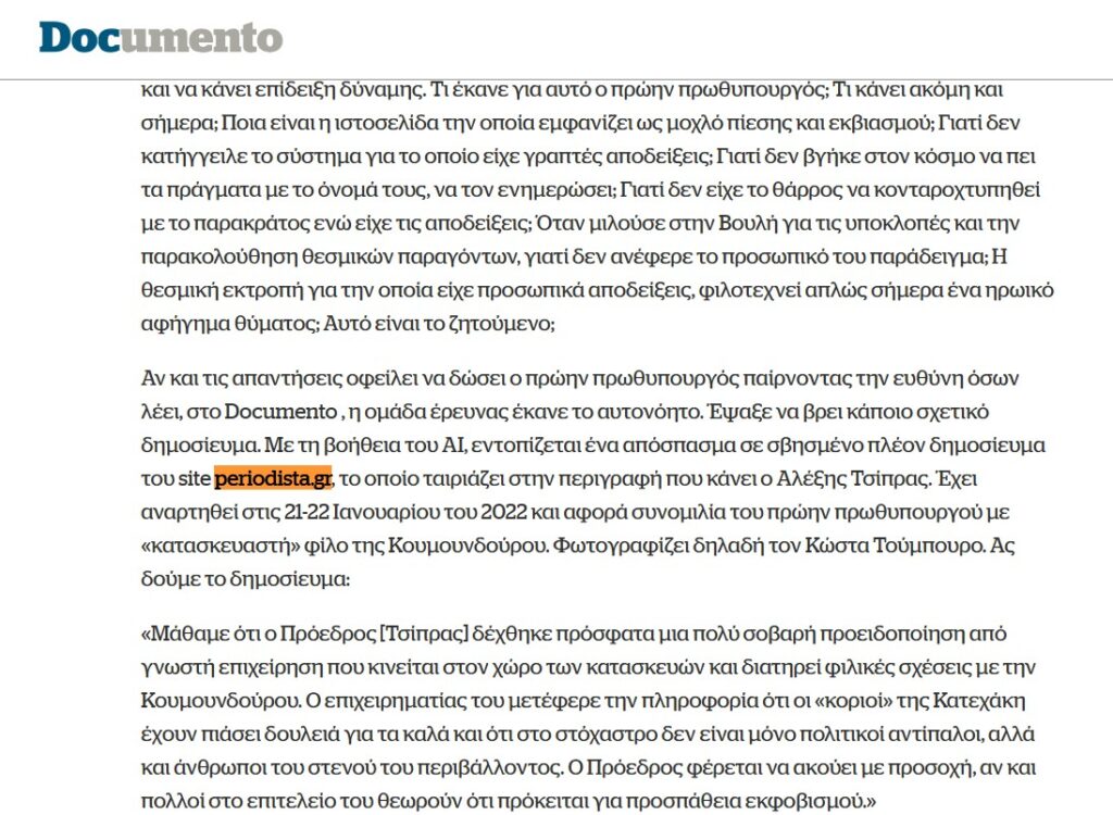 Στο επίμαχο δημοσίευμά του, το Documento αναφέρεται στις ανώνυμες καταγγελίες του Αλέξη Τσίπρα, ισχυριζόμενο ότι εντόπισε το «εργαλείο» του παρακρατικού εκβιασμού. Η ιστοσελίδα του Κώστα Βαξεβάνη υποστηρίζει ότι, με τη χρήση τεχνητής νοημοσύνης (AI), ανέσυρε ένα δήθεν σβησμένο δημοσίευμα από την ιστοσελίδα periodista.gr (ΕΠΑΝΑΛΑΜΒΑΝΟΥΜΕ: Το κείμενο αυτό δεν δημοσιεύτηκε ΠΟΤΕ στο Periodista.gr – Δημοσιεύτηκε σε άλλη ιστοσελίδα), το οποίο χρονολογείται στις 21-22 Ιανουαρίου 2022. Σύμφωνα με το Documento, το κείμενο αυτό αποτελεί την «απόδειξη» της παρακολούθησης, καθώς μετέφερε – κατά τα όσα γράφει ο Αλέξης Τσίπρας στο βιβλίο του – σχεδόν αυτούσια τη συνομιλία του πρώην πρωθυπουργού με τον επιχειρηματία Κώστα Τούμπουρο, στέλνοντας ένα σαφές μήνυμα ότι «το Μαξίμου τους ακούει».