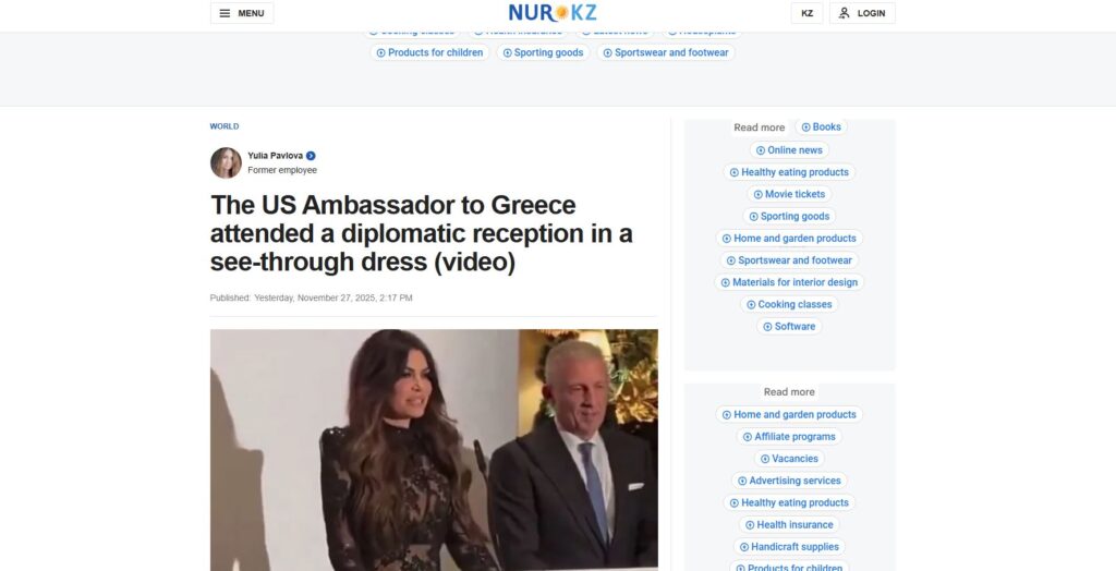 Η Πρέσβειρα των ΗΠΑ στην Ελλάδα, Κίμπερλι Γκίλφοϊλ, προκάλεσε διεθνή διαδικτυακό σάλο όταν εμφανίστηκε σε εκδήλωση για την Ημέρα των Ευχαριστιών με ένα ημιδιαφανές, διακοσμημένο φόρεμα, όπως αναφέρει το διεθνές μέσο NUR.KZ.