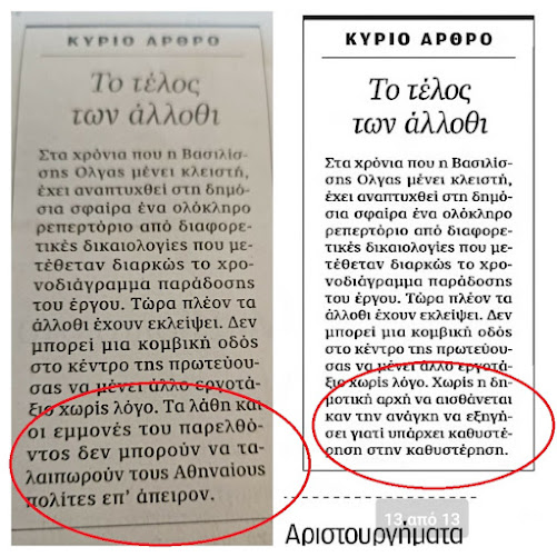 Η χθεσινή «Καθημερινή» προκάλεσε αθόρυβη αλλά ηχηρή συζήτηση με την ξαφνική αλλαγή στο κείμενο του κύριου άρθρου της για τα έργα στη Βασιλίσσης Όλγας. Η πρώτη εκδοχή είχε μια γενικευμένη κριτική, που πολλοί ερμήνευσαν ως αιχμή και προς την κυβέρνηση, χωρίς όμως να κατονομάζει υπεύθυνους. Λίγες ώρες αργότερα, το σημείωμα αντικαταστάθηκε με νέα διατύπωση που «έδειχνε» ξεκάθαρα τον Δήμο Αθηναίων για την καθυστέρηση των έργων.
